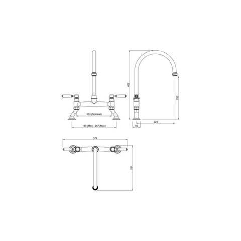 • Tap Dimensions: Overall Height - 402mm; Spout Height - 253mm; Spout Reach - 223mm; Base/Handle Width - 374mm