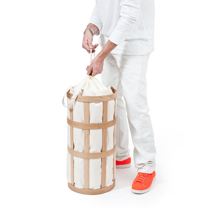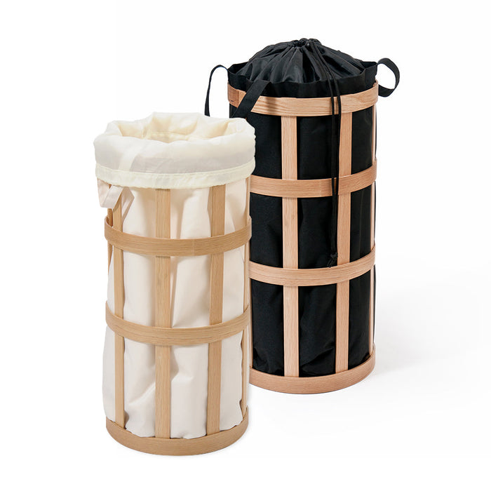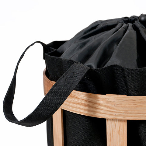 The bag holds its shape; two handles lift it easily in and out, no wrestling required. For privacy, close the top by pulling the thick pull-tie cord. Available with either a soft white or black bag insert to keep your colours and whites separate.