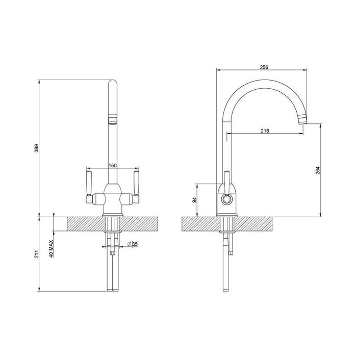 • Tap Dimensions: Overall Height - 389mm; Spout Height - 264mm; Spout Reach - 216mm; Base/Handle Width - 150mm