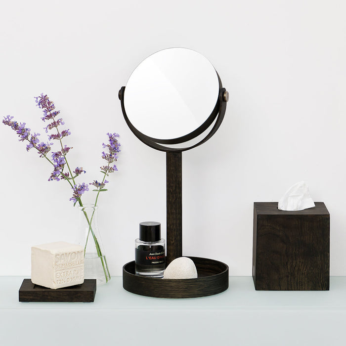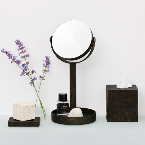 Made from sustainably harvested, solid American white oak, and oak veneers, finished with a matt, dark stain water resistant lacquer. All edges look crisp but are finely hand sanded to make them soft to the touch. Design by Lincoln Rivers.